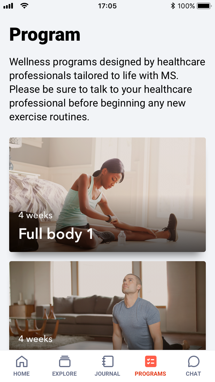 The Explore section provides articles and videos to help users live better with MS. This includes reliable health information, patient stories, and practical advice. Content can be personalized to match user preferences.