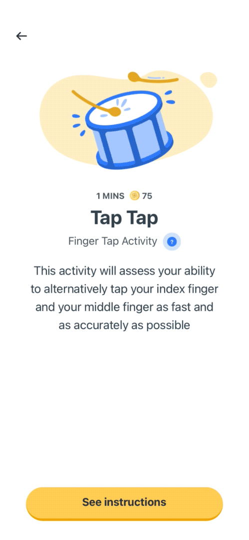 Tests finger tapping speed and accuracy. Users tap alternately with two fingers on the smartphone screen as many times as possible.