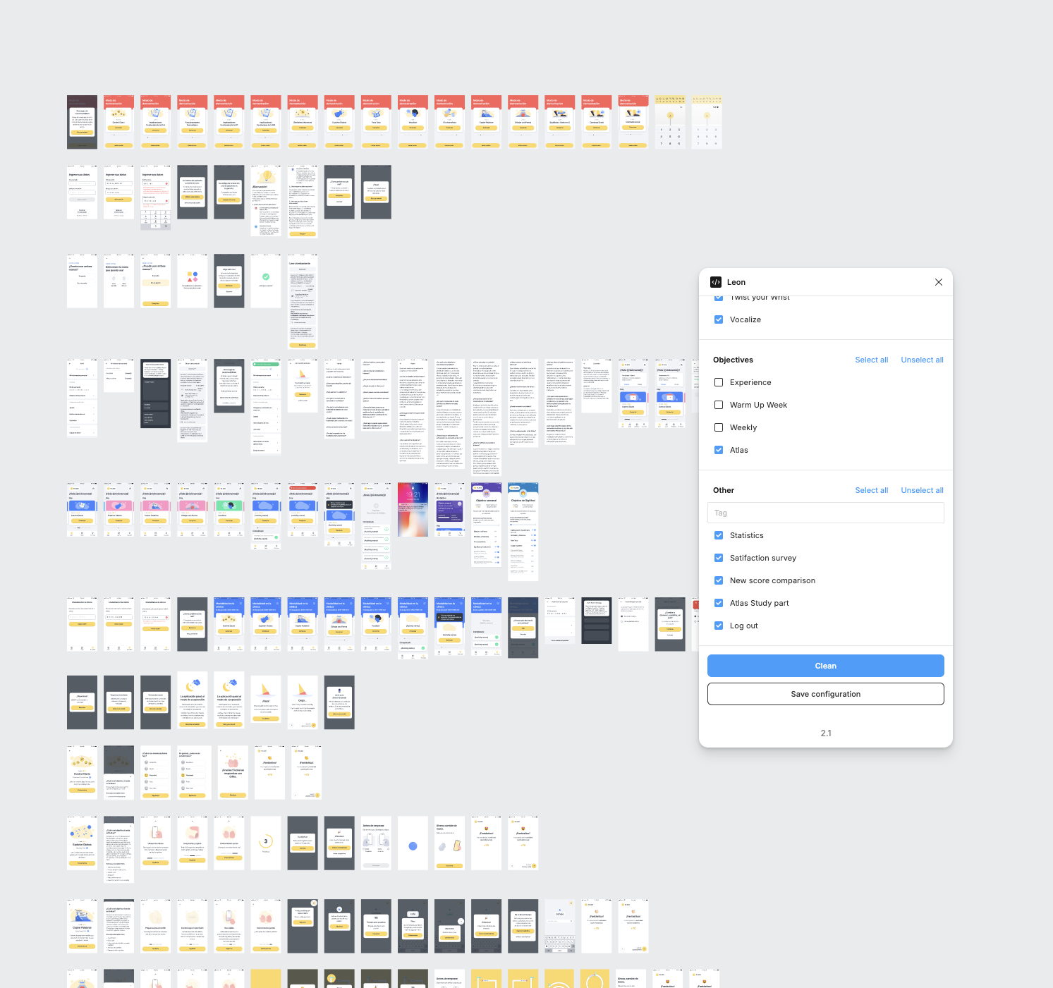 The plugin applies study and country specific configurations to a Figma project by cloning the full master page, then automatically removing non-eligible screens so only the legally validated flow remains. It hides or shows features based on selected tests, updates component states (pagination, tab bar, profile, clinic settings), reorganizes all frames, and supports importing/exporting configurations through a .irb file.