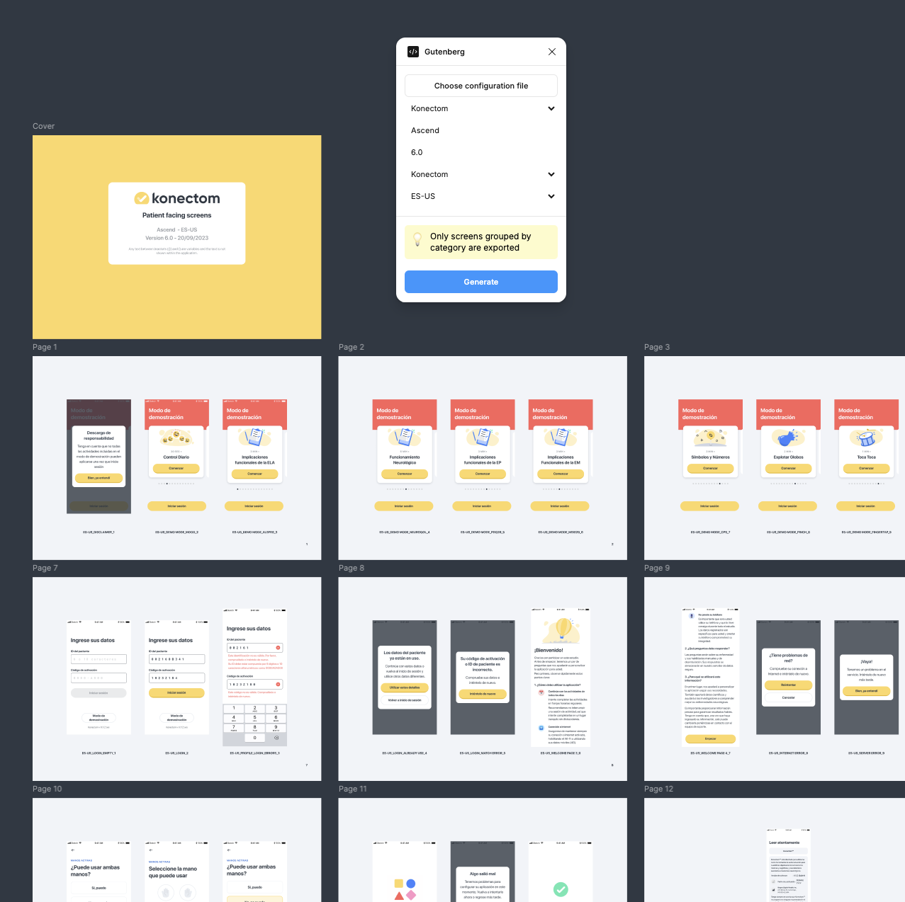 We developed an internal Figma plugin that collects screens, exports them as images, and inserts them into a page template. It automates page generation, handles multiple languages and versions, and creates project-specific cover pages with metadata.